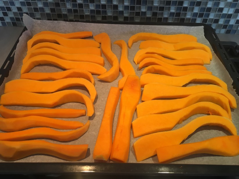 Clean and cut into stripes the pumpkin and cook in a preheated oven at 200gr for 30 minutes, than let cool.
