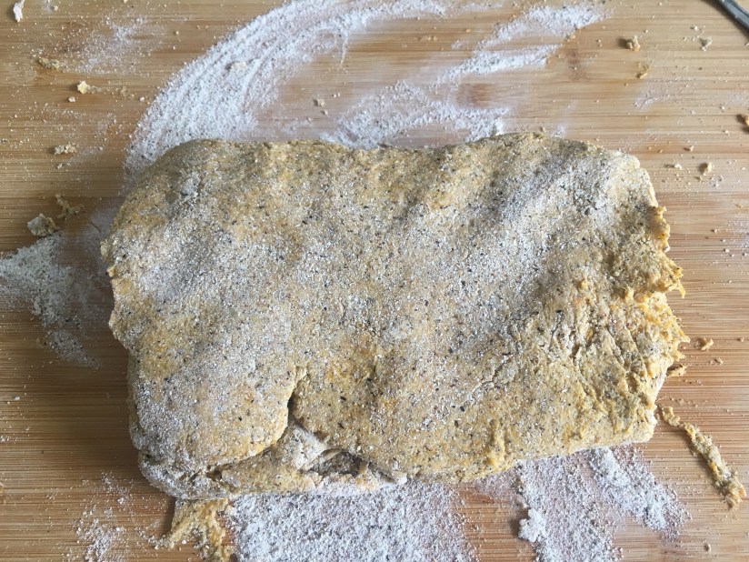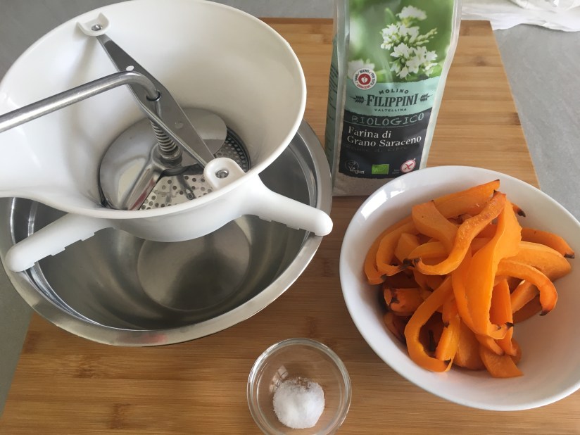 Use a vegetable mill and mash the pumpkin. Add the flour, the salt and combine all together, let the mix set for 10 minutes then spread on the floured pastry board.