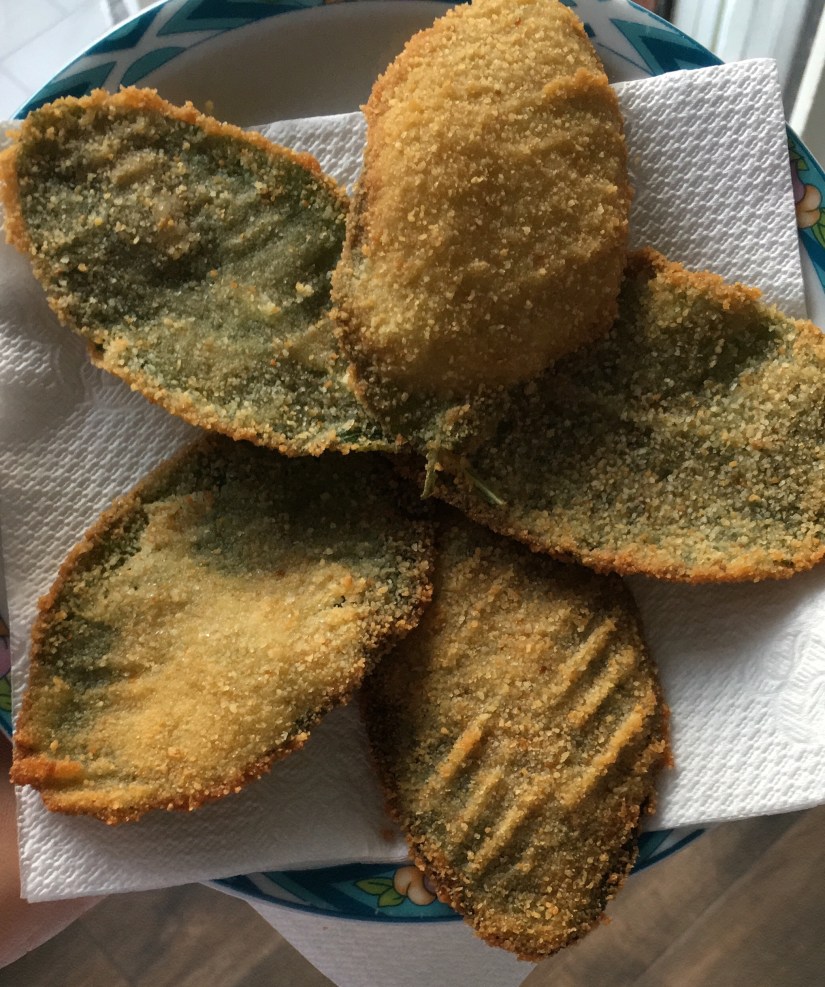 Wash well the sage leaves, beat the eggs and seasoning, put the leaves on to the eggs beaten , holding it above the bowl momentarily to allow any excess to drip off before transferring to the breadcrumb. Pat the crumb firmly onto the leaf using your hands and covering all over before once again shaking gently to remove any crumbs that have not completely stuck. Deep fry in a large saucepan.