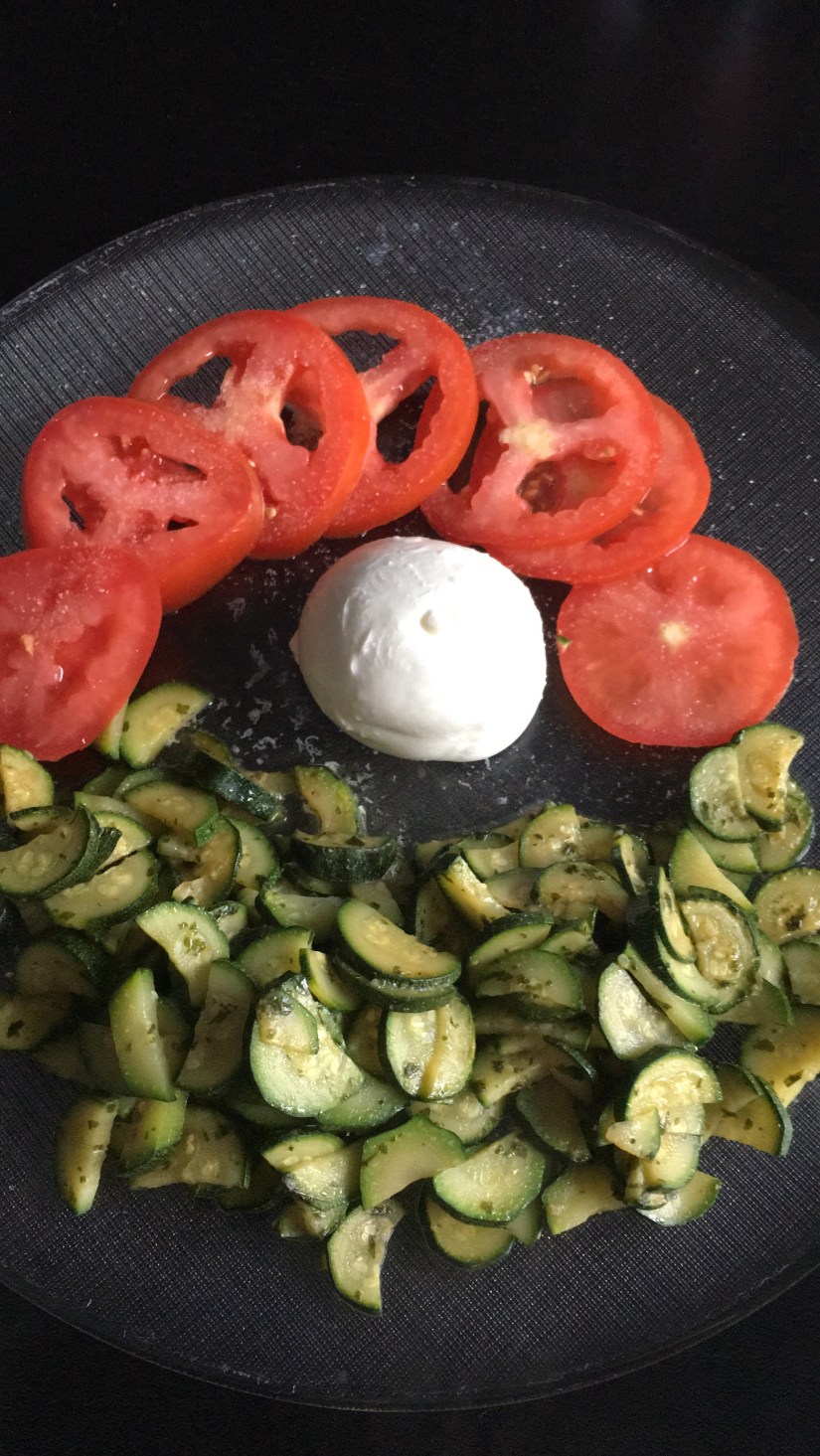 mozzarella and basil ๐ฟ. I didn’t have ๐ฟ basil ( I used all to make my basil pesto ๐) and instead I used stir-fry zucchini.
